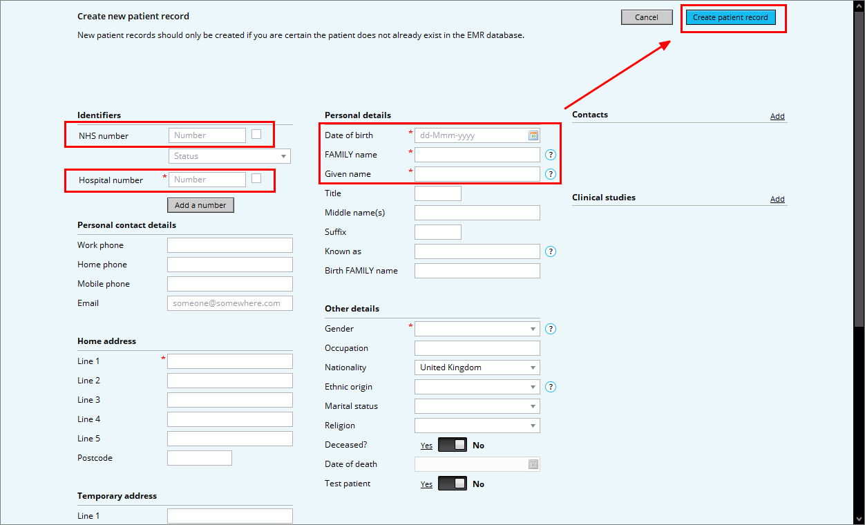Ensure the Hospital number (MRN), NHS number, Family name, Given name and DoB exactly match the details in NUTH PAS / eRecord.  Failure to accurately copy the details will lead to a duplicate patient being created.
