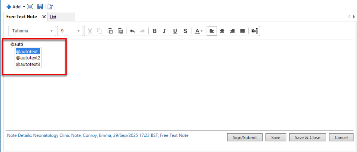 Follow these steps to insert you auto-text into a note.