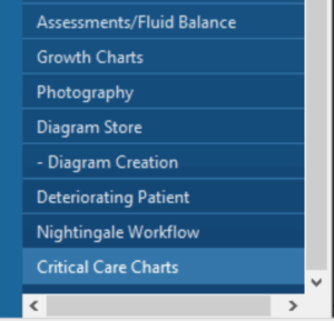 Once you have your patient, scroll down the blue menu on the left hand side of your screen and look for “Critical Care Charts”.