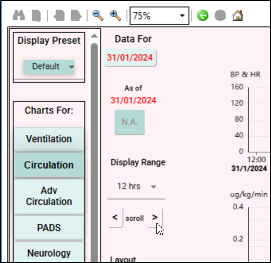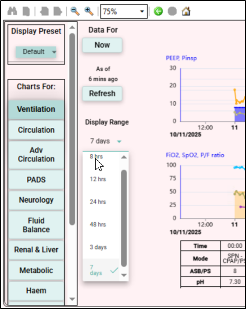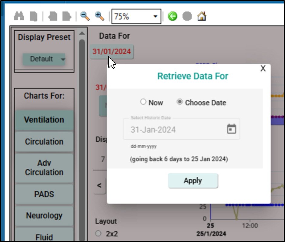 You can choose the date to load by clicking on the date shown below “Data For” in the top left of the “Critical Care Charts” screen. This will show a “Retrieve Data For” window where you can choose “Now” (today and the last 6 days) or “Choose Date” (the date you choose and the 6 days before that date).