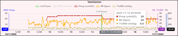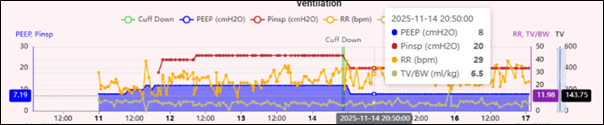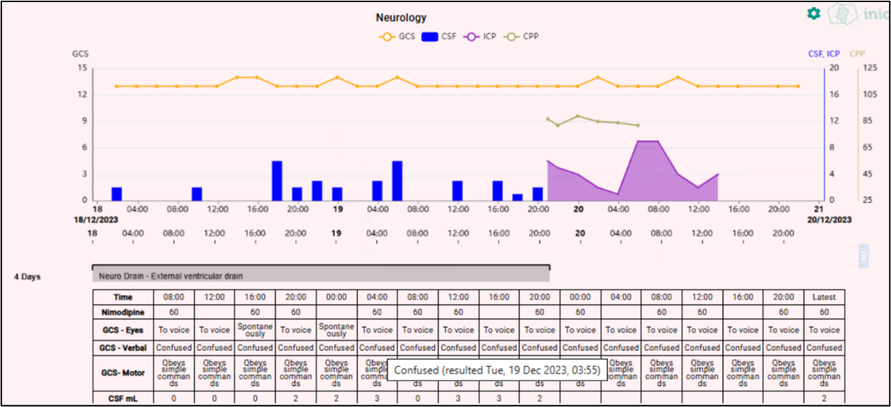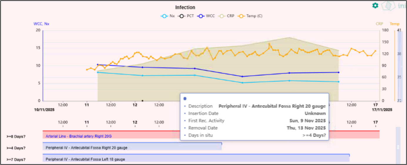 Lines, drains and tubes are displayed in relevant systems.  They display as a horizontal bar which is colour coded for device type.  Duration and descriptor information is provided to the left of the bar.