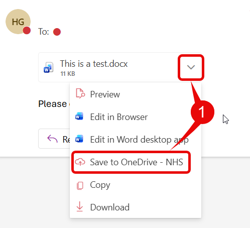 - In Outlook, click on the drop-down arrow to the right-hand side of the attachment in the email and, select Save to OneDrive – NHS