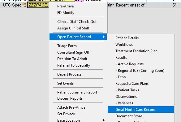 1. Right click on the patient name and select ‘Open Patient Record > Great North Care Record’