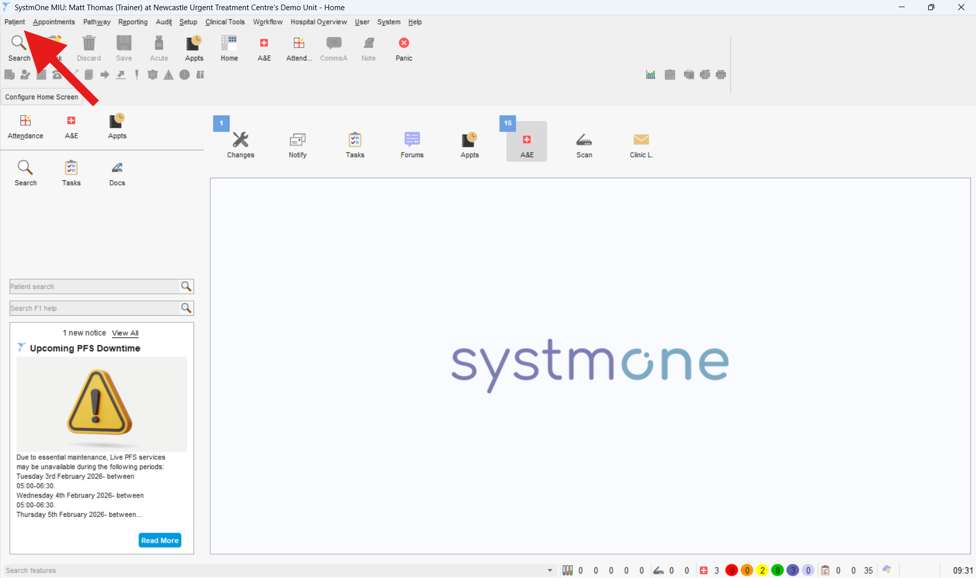 Click the patient tab in the top left corner of the screen.  (Alternatively you can press F10 on the keyboard or select the search icon in the top left corner).