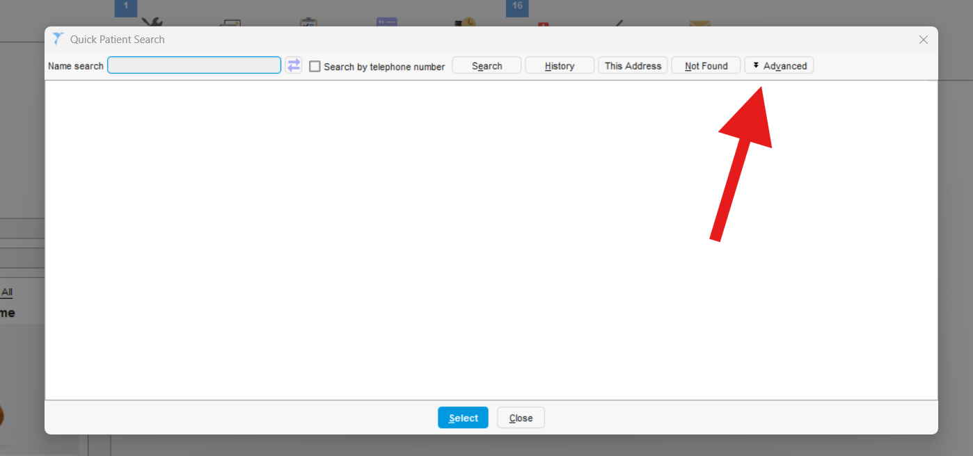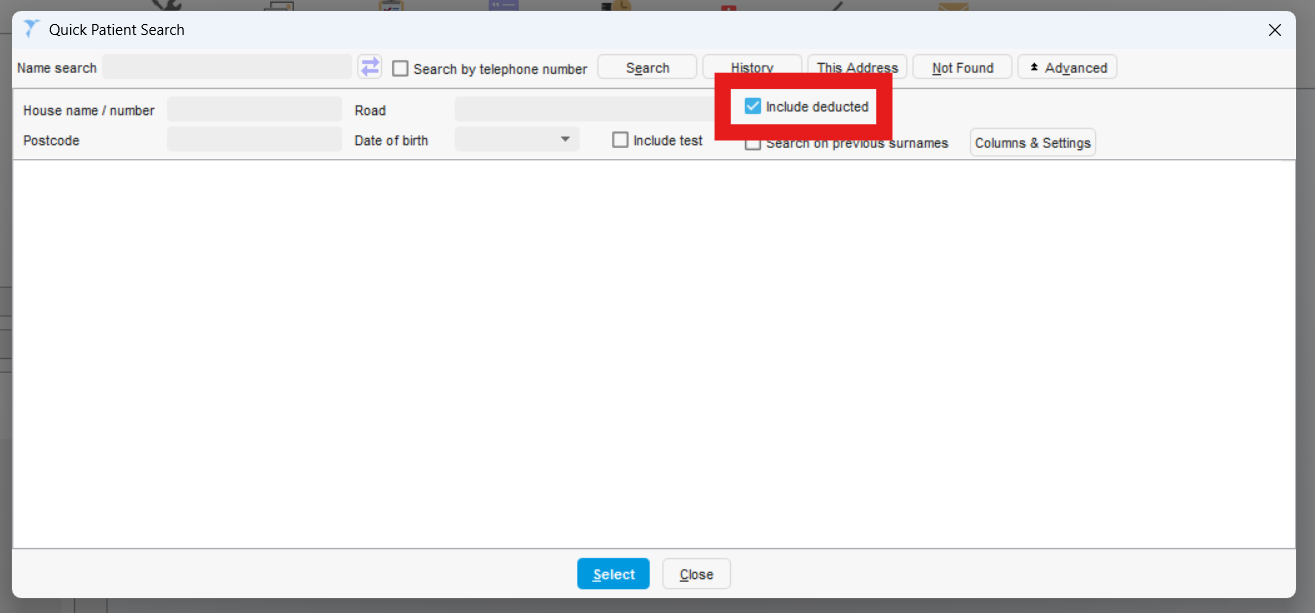 A window will open for you to search for the patient in.  Click on advanced search and check the box “include deducted patients“.  Including deducted patients will include patients who have been registered at NUTH in the past, but are not currently receiving care.