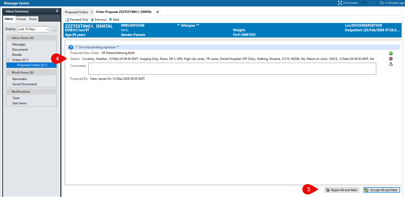 When a student working in the Dental Hospital places any type of order the order will remain in the Proposed status until it is it accepted by a clinician. This guide shows how to accept a proposed order.