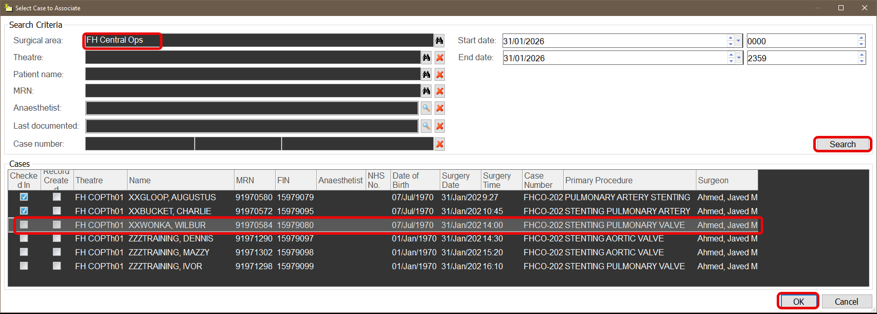 3. Ensure the correct Surgical Area is selected and press Search. Confirm the correct patient name, MRN and procedure and select the patient. Click OK.