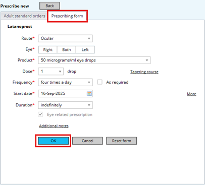 Or it will take you straight to a prescribing form where you can fill out all mandatory fields, then click OK once finished: