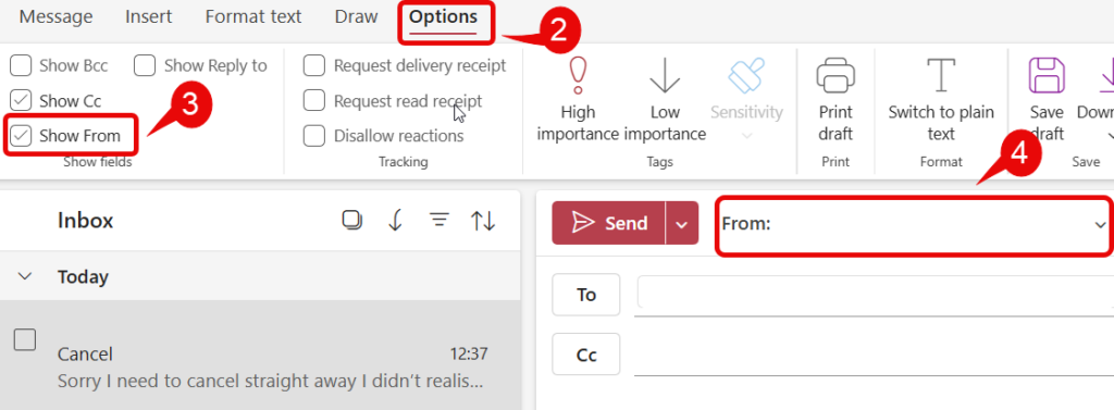 - Click the drop down arrow in the From window to select your shared mailbox if it automatically is not appearing.