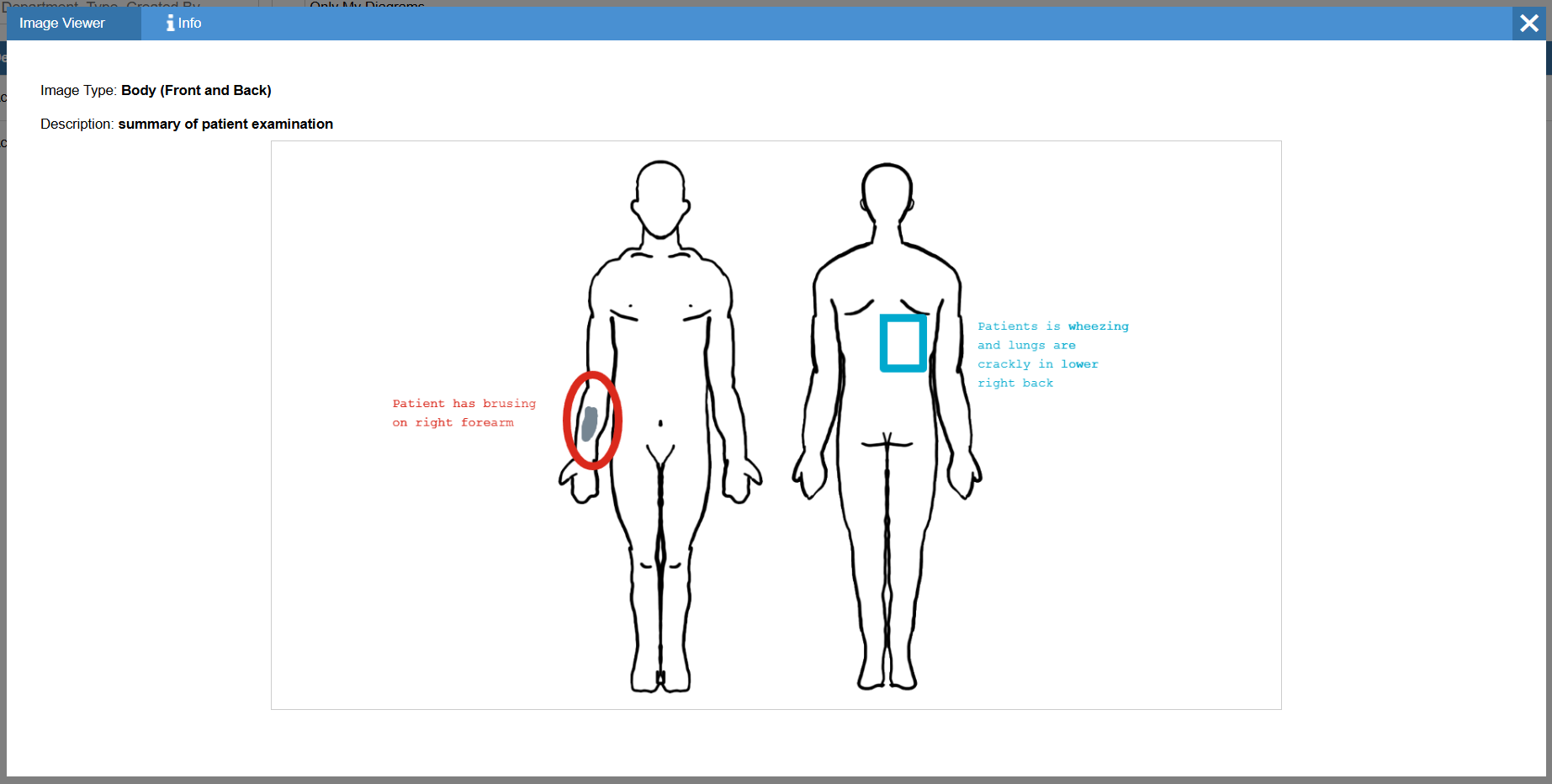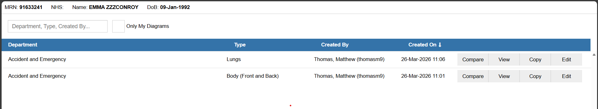 All previously created diagrams for the given patient will be shown in a list. You can search for lists using the search bar at the top and searching for the Department, Type or person who created the diagram. Alternatively, you can tick the “Only My Diagrams” box to filter out any diagrams created by other members of staff.