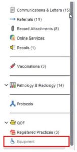 - Open the patient’s record and navigate to the clinical tree to find the equipment node (you can also access it on your templates if there has been a quick link set up).