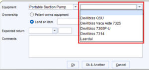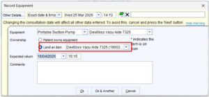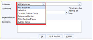- To finish recording the equipment given to patient, click ‘Ok’ or ‘Ok & Another’ to record another equipment item.
