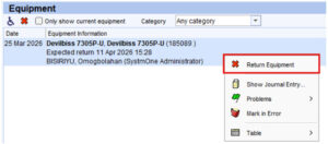- Right click on the equipment item and click ‘Return Equipment’.