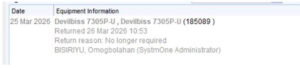 - The equipment will now be displayed in grey to show it has been returned.