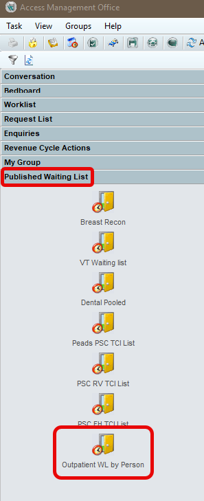 - From the Published Waiting List, select Outpatient Waiting List by Person, then search for the patient using their MRN, NHS number, or initials and date of birth.