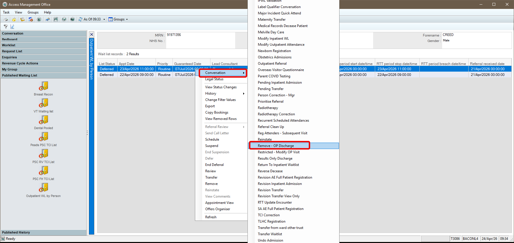 - When the waiting list is displayed, right‑click on the correct line of encounter information. From the menu, select Conversation, then choose Remove – OP Discharge from the sub‑menu (scroll if required).