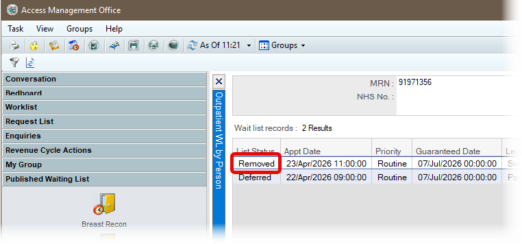 The Outpatient Waiting List by Person displays a List Status of Removed.
