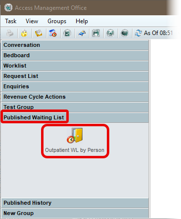 In this example, I am using the Outpatient Waiting List by Person from the Published Waiting List tab in PM Office. There are other Outpatient Waiting Lists that can be filtered by Consultant/Specialty. You can add these waiting lists to your own Favourites “My Group”; please see the