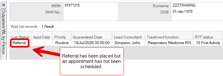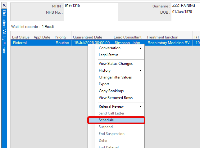 - From the Published Waiting List, select Outpatient Waiting List by Person, then search for the patient using their MRN, NHS number, or initials and date of birth.