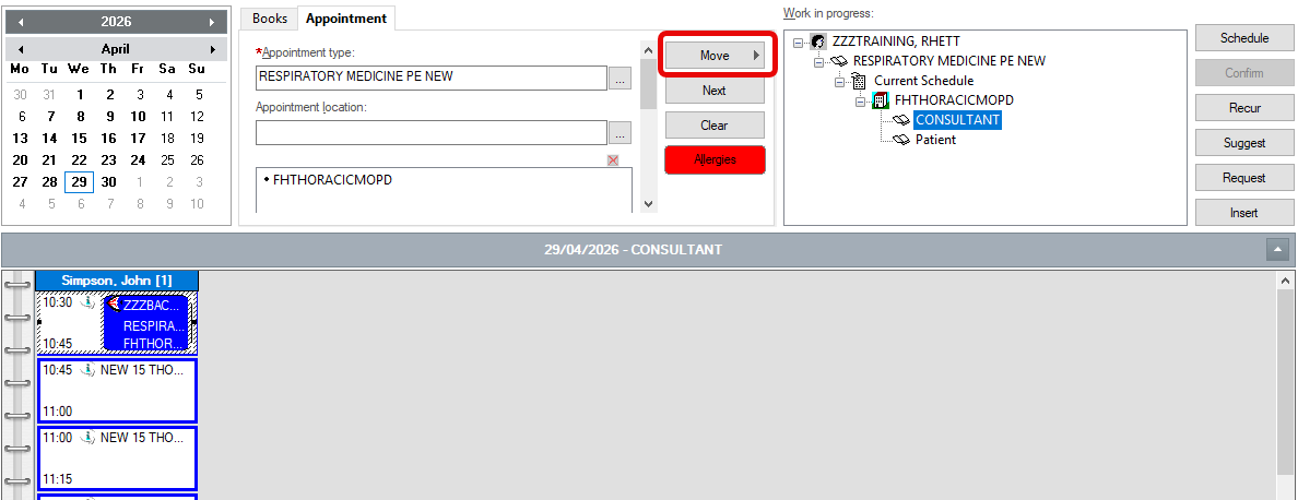 - Clicking the Move button will transfer the appointment details to the Work in Progress section and an appointment date and time can now be given.