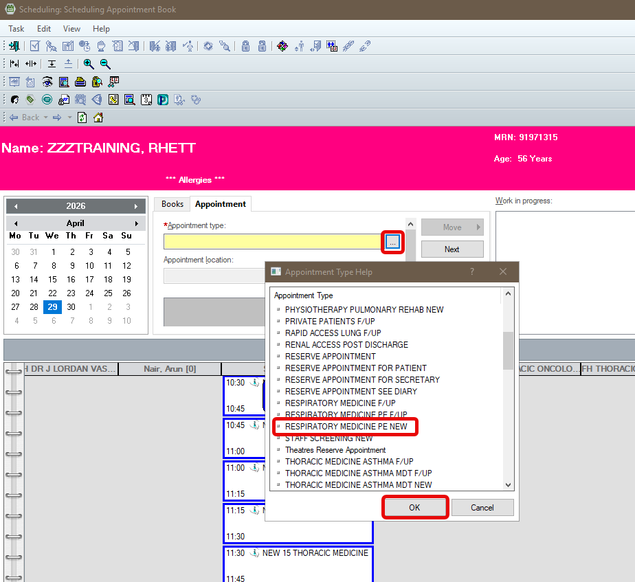 - Complete the Appointment Type field by clicking the ellipsis (…) to view all appointment types for your service, make selection and click OK. Note: you can type the first few letters so that you see a filtered list of appointment types.