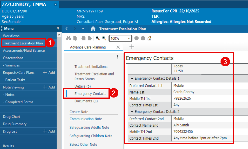 - If documented, Emergency Contact information will display (if already documented check that they are up to date)